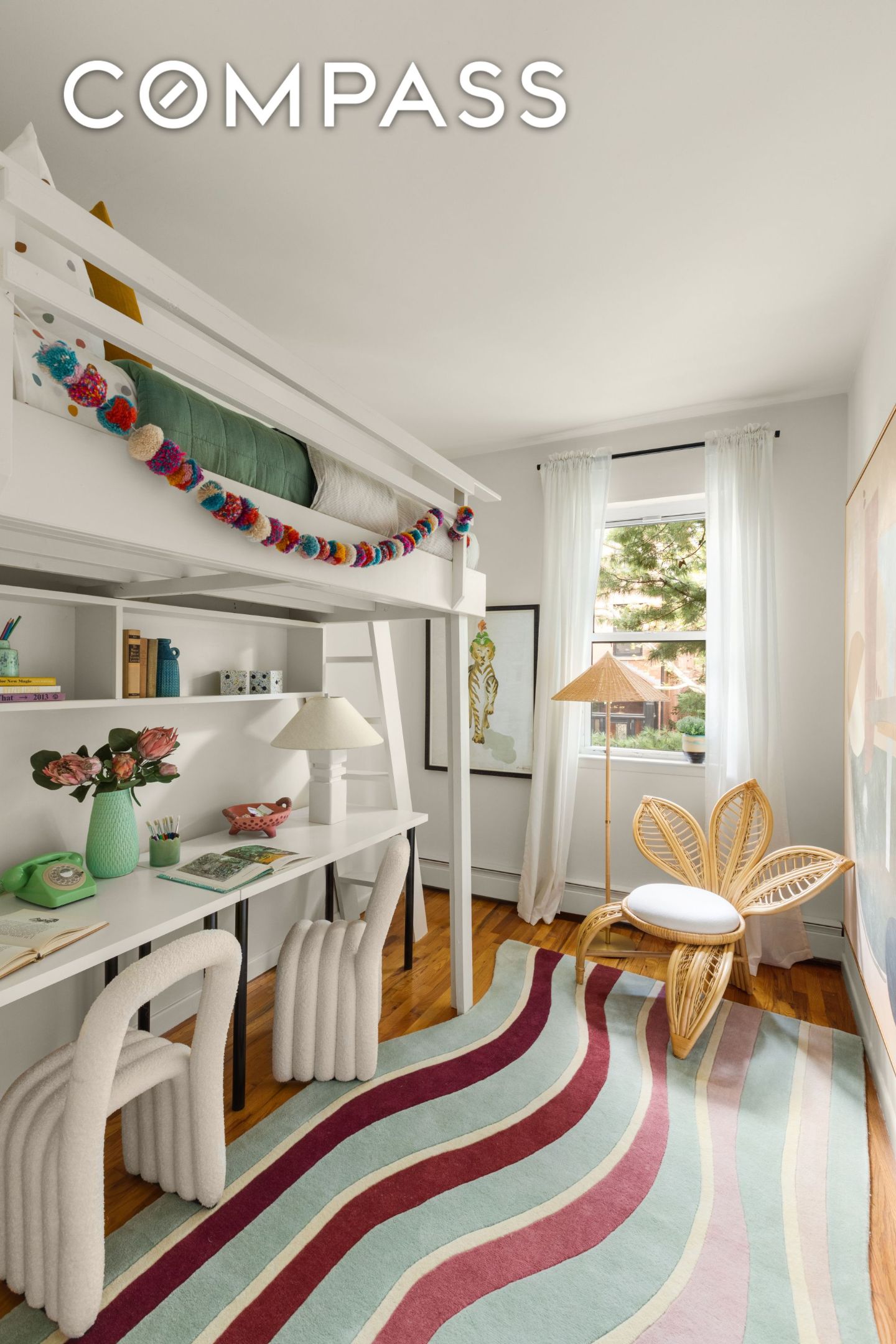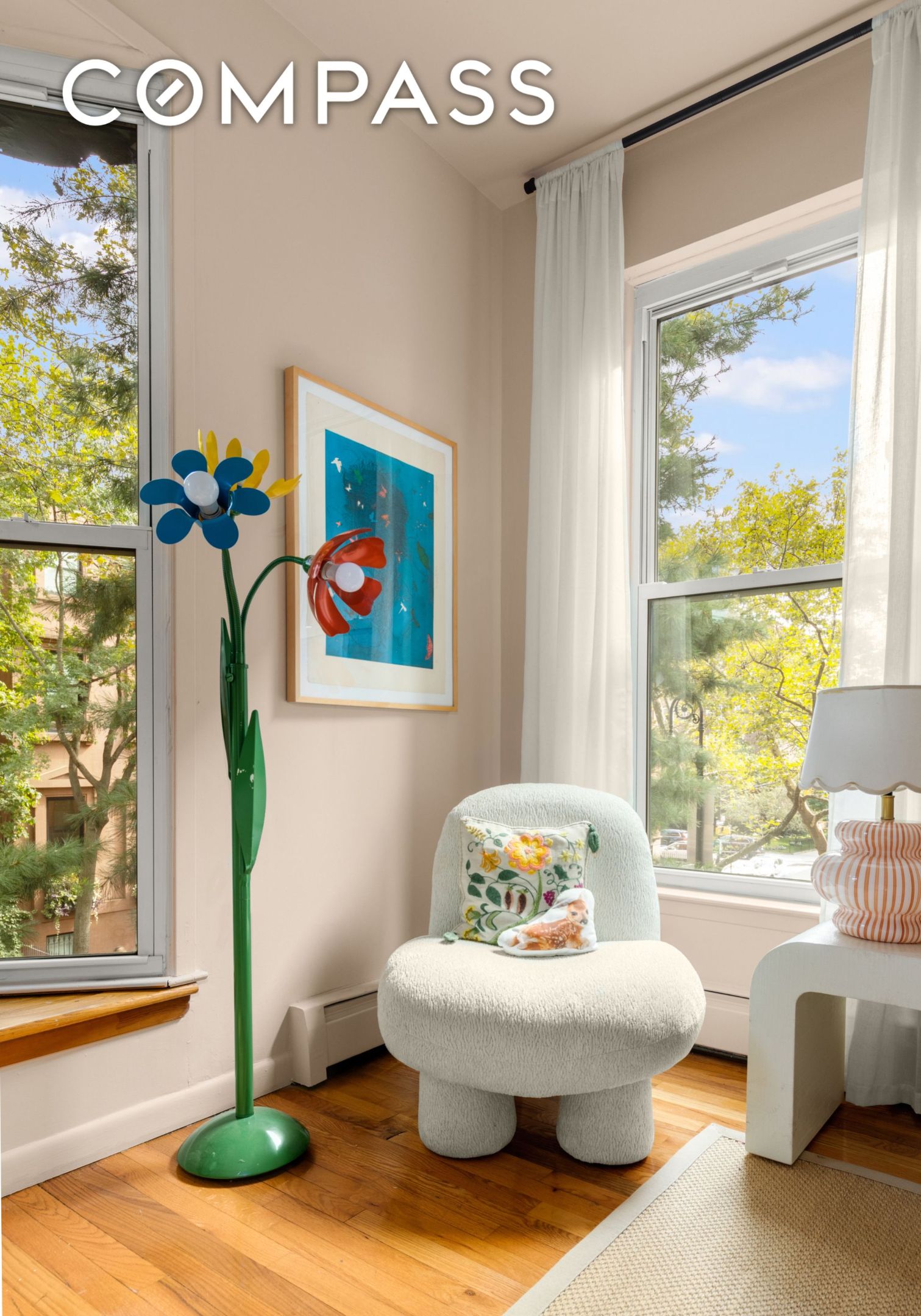 A sun-filled four-bedroom, two-bathroom home with three exposures, lush treetop views, and an ideal layout awaits on the second floor of a charming coop in the heart of Cobble Hill.