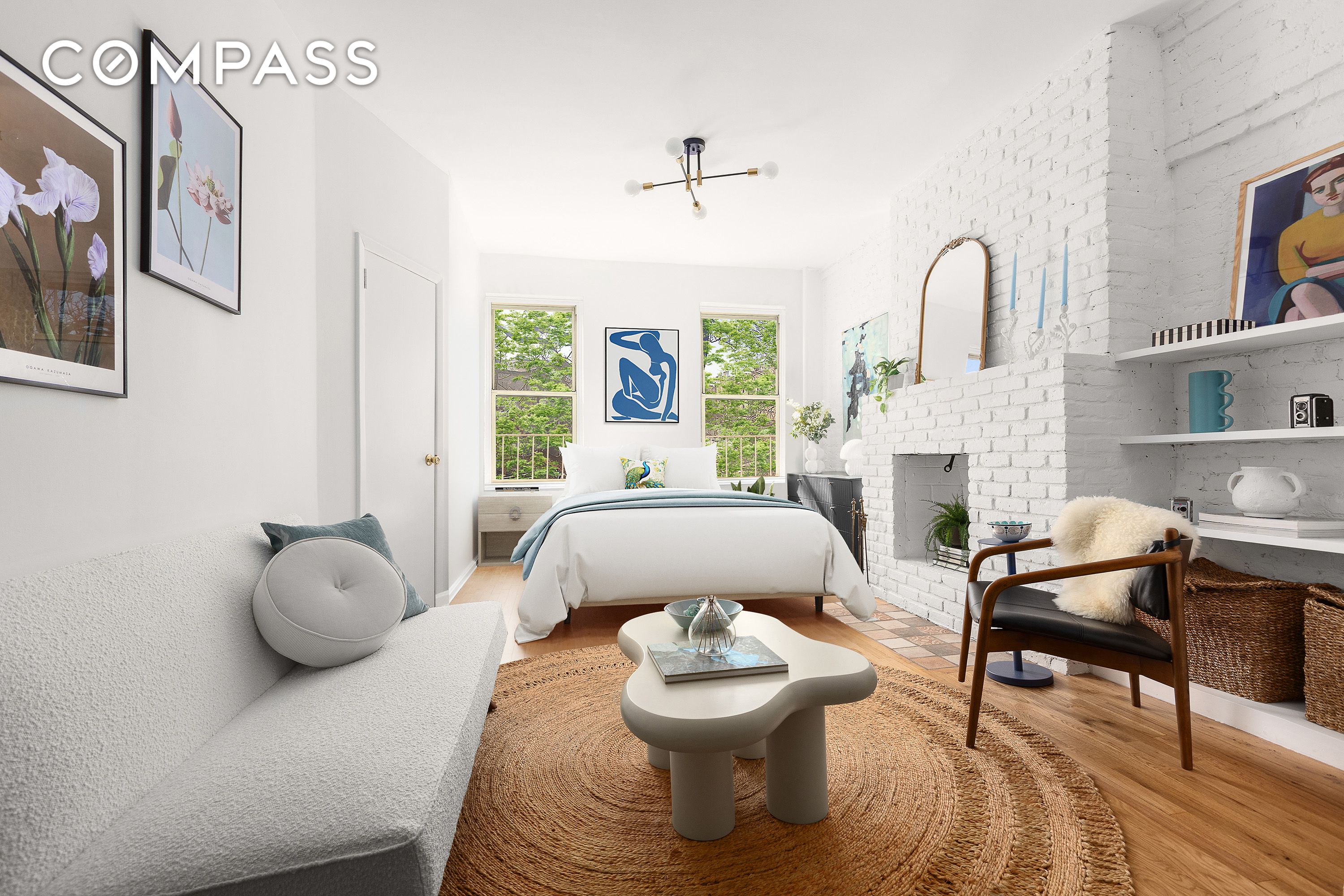 OPEN HOUSES BY APPOINTMENT ONLY! Nestled on a quiet tree lined street in the heart of the West Village, this south facing prewar studio seamlessly blends timeless charm with modern updates paired with an abundance of natural light. Just three flights up, this unit's open layout maximizes every square foot. A cozy dinette area in the kitchen and a decorative brick fireplace in the living room both look out onto the serene garden area and a beautiful oak tree that blooms before your eyes.