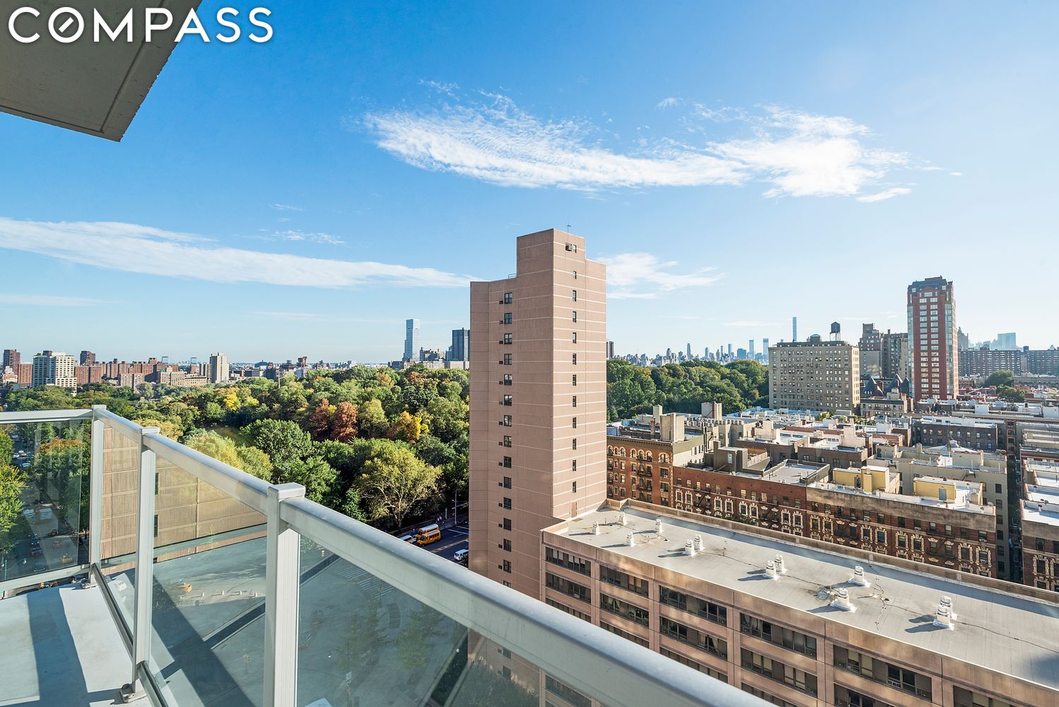 OPEN HOUSES BY APPOINTMENT ONLY! A split two-bedroom, two-bathroom home in excellent condition with a terrace in a full-service condominium perched on a high floor with jaw-dropping views of Central Park, Morningside Park, and the Manhattan skyline. Every room of this immaculate apartment is windowed, including both luxurious spa-like bathrooms equipped with deep soaking tubs, and the incredible open kitchen fitted with ample chocolate cabinetry, stainless steel appliances, beautiful quartz countertops, and a white marble subway-tiled backsplash. High ceilings, oak floors, several custom closets including a large master walk-in, and recessed lighting are throughout, and a washer/dryer is a phenomenal convenience. One Morningside Park is a pet-friendly building loaded with amenities including a fully attended lobby, roof deck, fitness center, cold storage for food deliveries, and bicycle room.