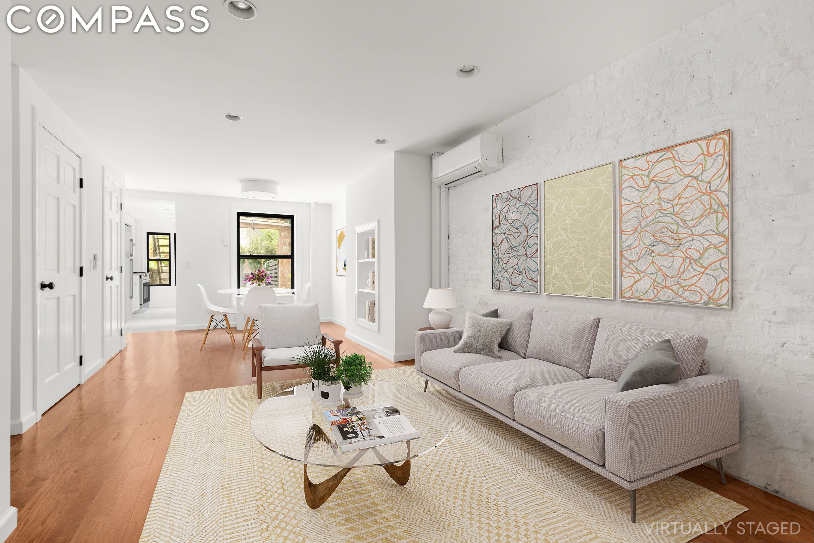 Throughout the residence, recessed lighting, freshly painted walls, exposed brick, and new light fixtures contribute to a sophisticated and inviting ambiance. The thermostat-controlled ductless AC ensures year-round comfort.